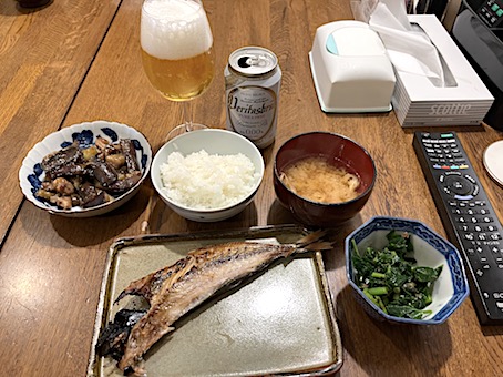 夜は、鯵の干物に茄子と肉の炒め物、モロヘイヤみたいなの?