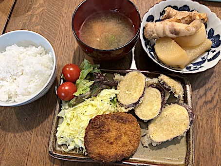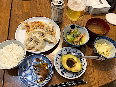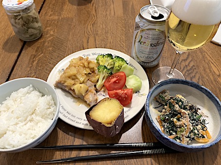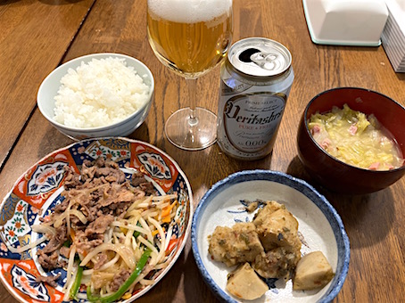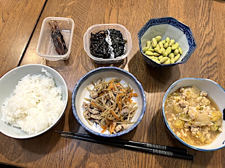 夜は、鶏唐揚げ、ほうれん草卵炒め、コールスローなど。