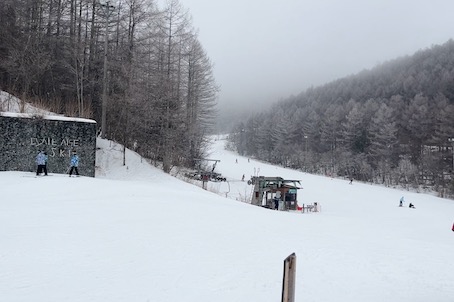 ゴンドラで上がった頂上はかなりガスっていて視界不良。初めてのゲレンデなので、視界が悪いとちょっと不安。
