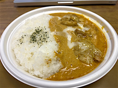 お昼は、ふるさと納税の返礼品で貰っていたレトルトカレー。今日は「バターチキン」にいたしました。残り、あと二箱。