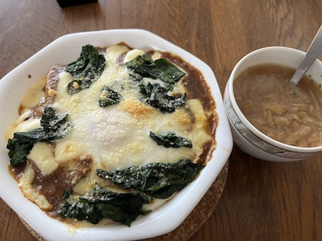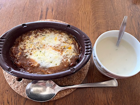 Today's Lunch・・・・・、帰りに成城石井に寄って買ってきた「ミモレットとエメンタールのドライカレー」とポテトサラダにキャロットラペ。