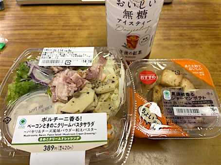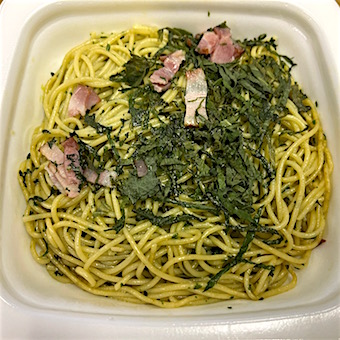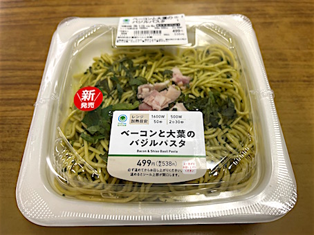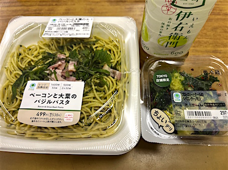 Today's Lunch・・・・・、ファミリーマートの「ベーコンと大葉のバジルパスタ」と「ブロッコリーとケールのペペロンチーノ和え」、両方で630kcal也。