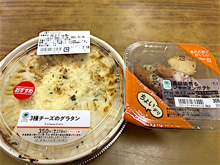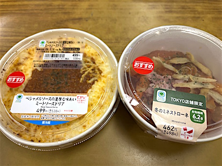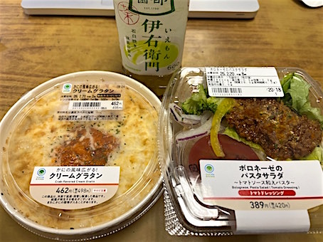 Today's Lunch・・・・・、ファミリーマートの「かにの風味広がる!クリームグラタン」と「ボロネーゼのパスタサラダ」、両方で577kcal!