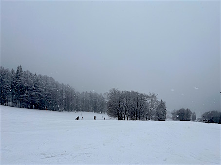 天候、明るい曇りで雪もチラチラ、上部は雲の中という感じで視界も悪そうだし、とりあえず下部の遠見、飯森で滑ることに。